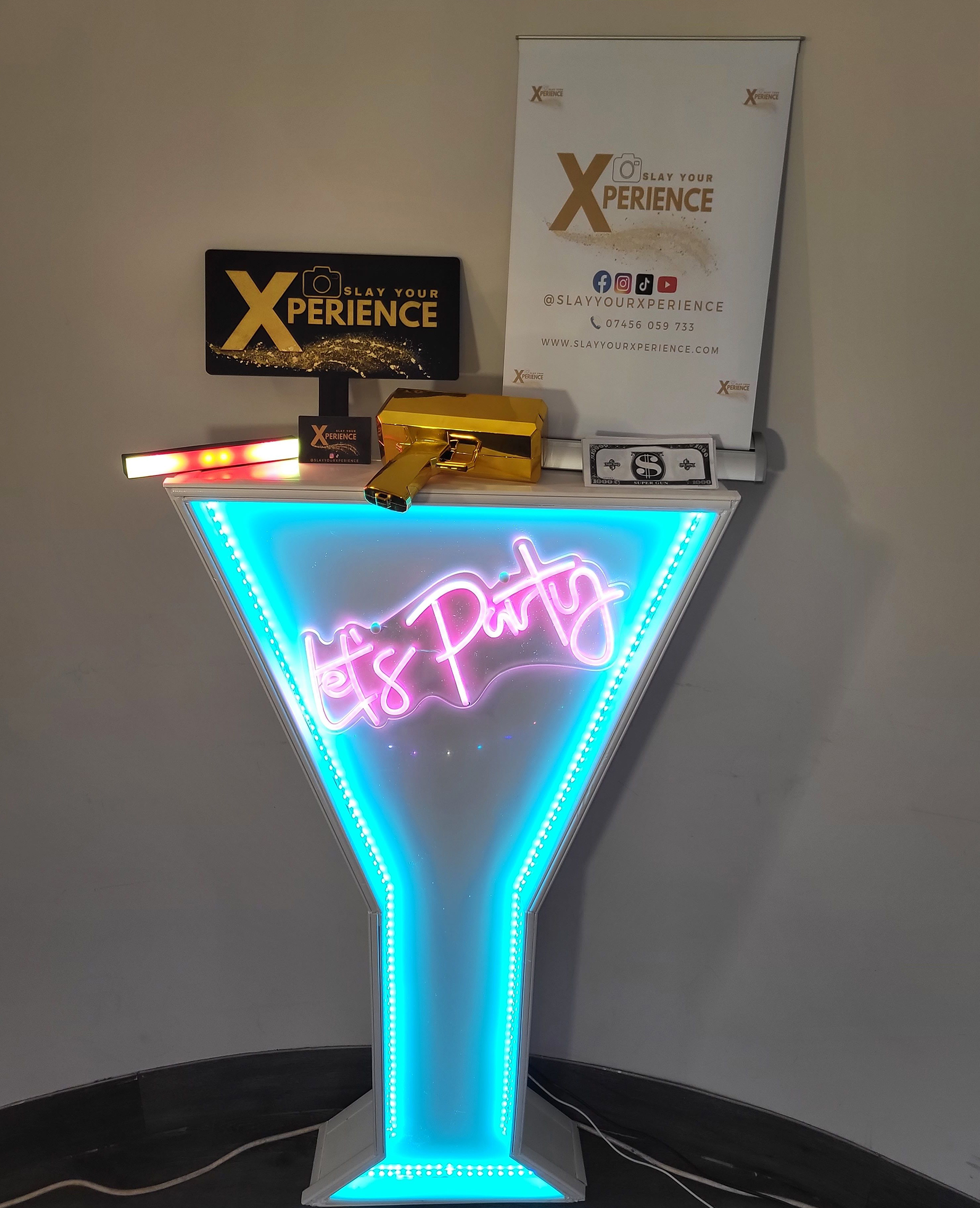 includes our 360 Photo Booth, a bespoke enclosure, velvet ropes, entertainment props,